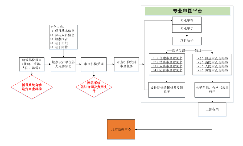 图审单位在审查结果出具后5个工作日内通过施工图联合审查系统平台或政务网平台数据中心直接备案,根据项目专业情况,短信告知建设、人防、消防、气象部门。